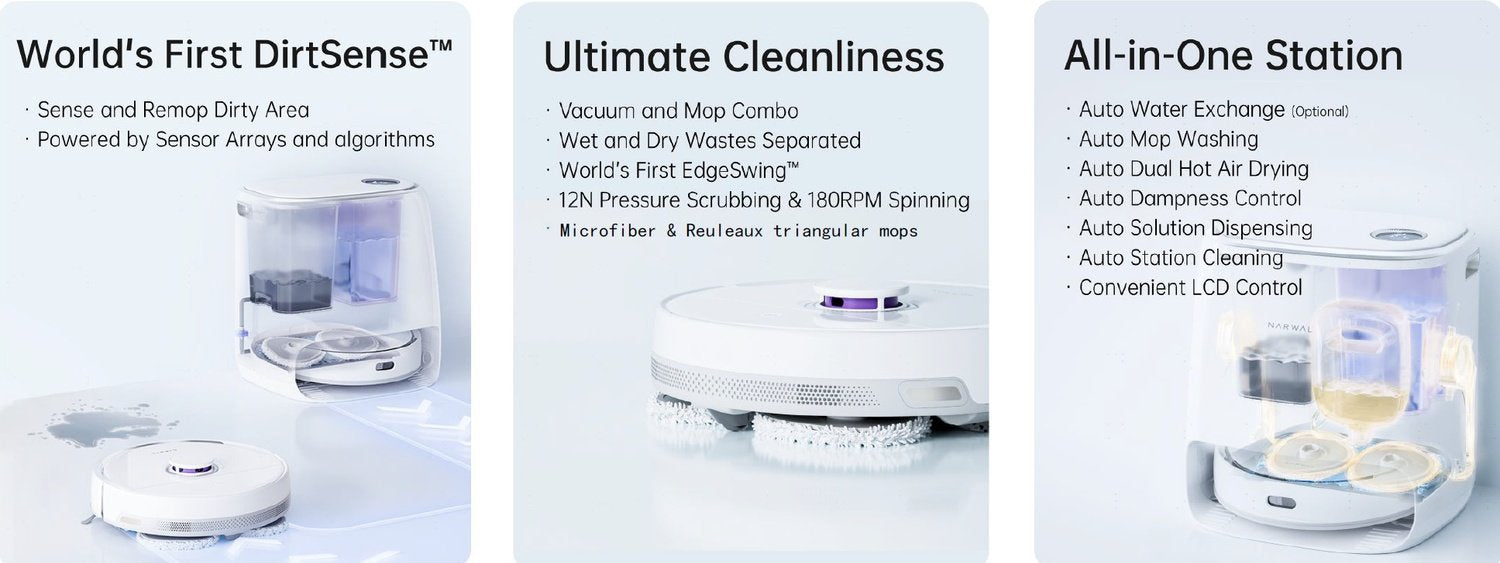 Narwal Freo Robotstøvsuger og moppekam, vask og tørring, Dirt Sense Ultra Clean, automatisk tilsætning af rengøringsmiddel, LCD-display, Smart Swing, Arc Route, Wifi, APP Control, Hvid