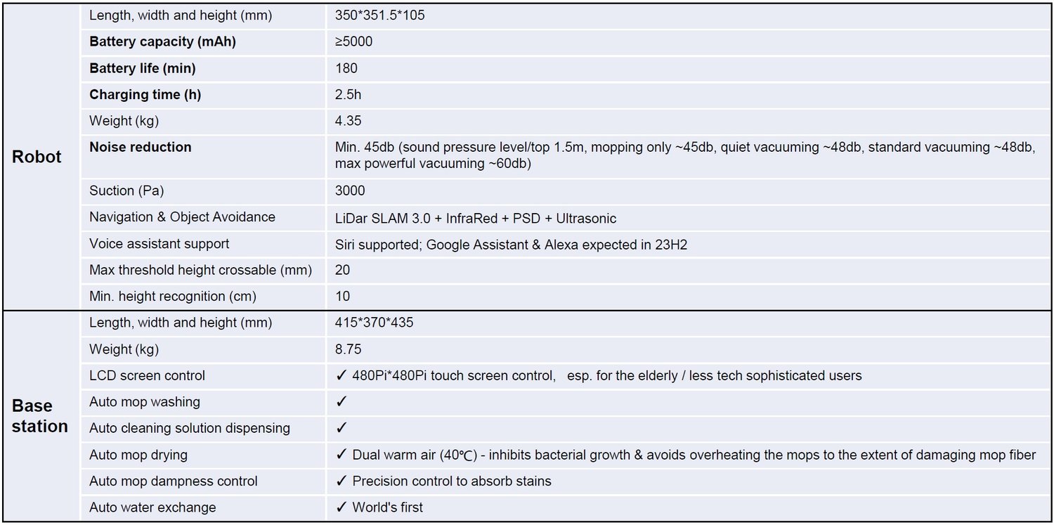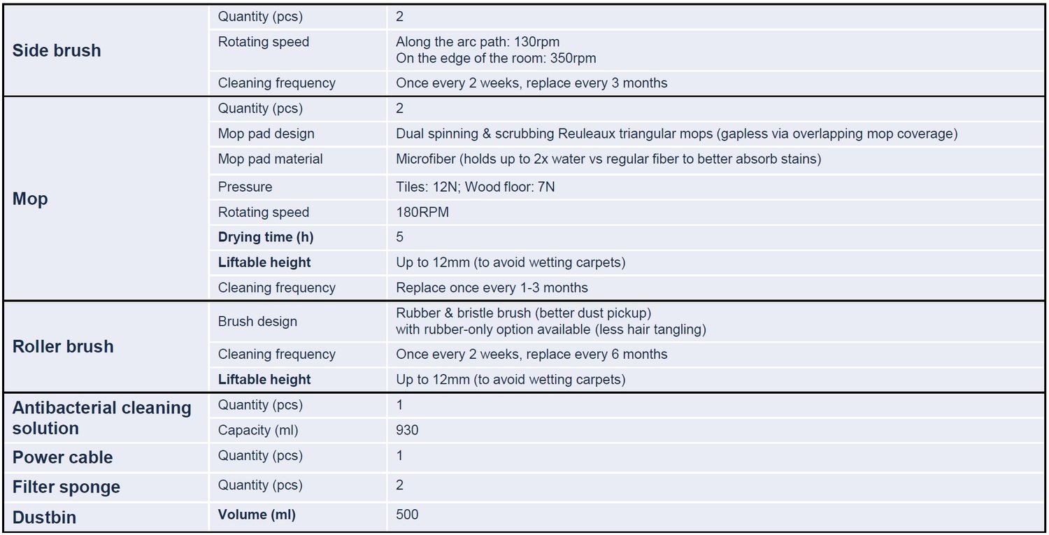 Dirtsense Ultra Clean: I modsætning til andre robotmopper og -støvsugere registrerer Freos Dirtsense*-teknologi intelligent, hvor snavsede moppepuderne er. Derefter renser Freo moppepuderne med højhastighedsspinning ved hjælp af den nøjagtige mængde vand blandet med en videnskabelig andel af gulvrengøringsmiddel (inkluderet i pakken). Smart Swing-mopning: Støv og pletter langs vægge og fodpaneler kan være vanskelige at nå for mange robotmopper og støvsugere. Takket være Corner-Traps*-teknologien aktiverer Freo robotstøvsuger og -moppe med jævne mellemrum Smart Swing, som tager sig af støv i hjørner og ved fodpaneler.