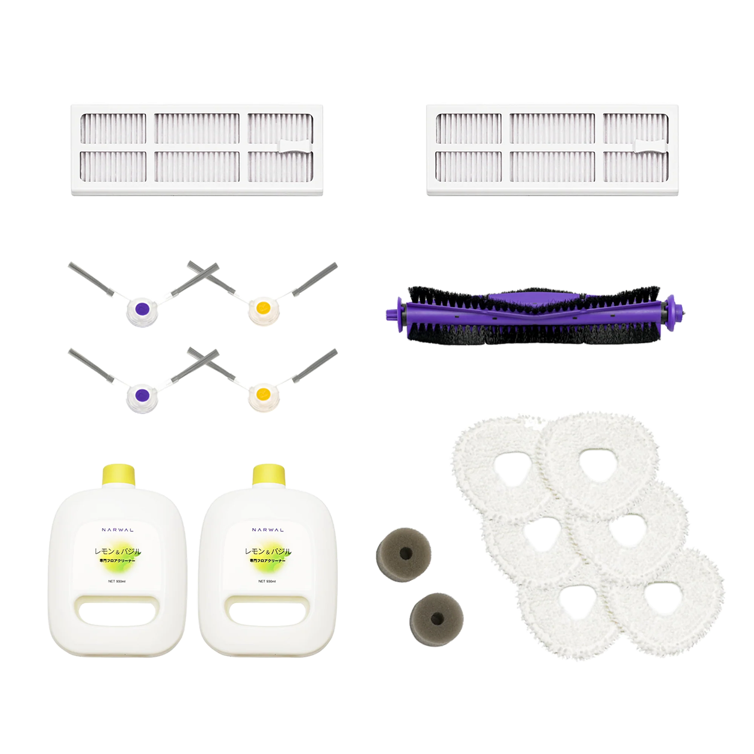 Pakkeindhold: Silent Head Børste x 1, Sidebørster par x 2, moppeklude par x 3, HEPA Filter x 2, Tank Filter x 2 og Special Cleaner (930ml) x 2