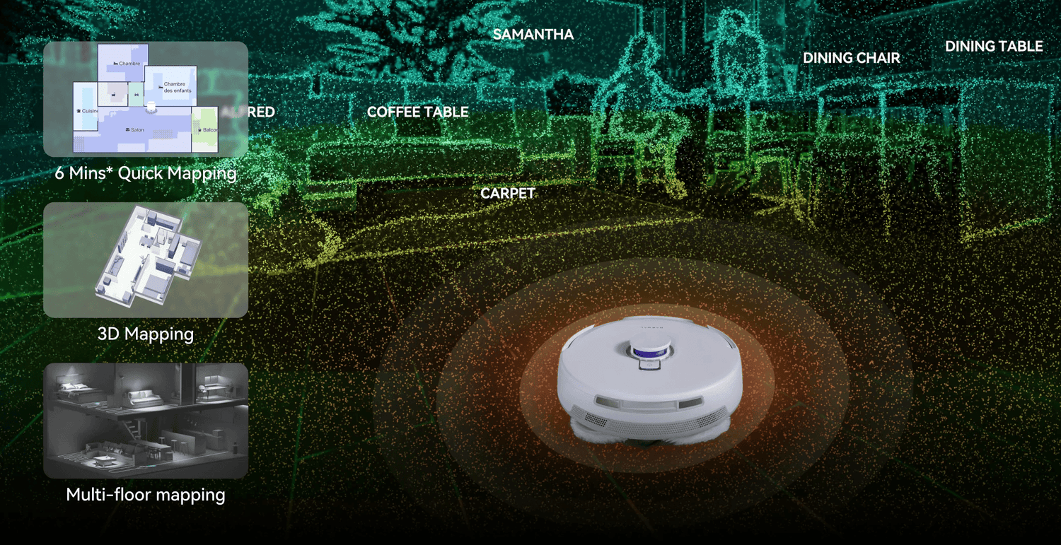 - Identificerer og undgår over 120+ husholdningsgenstande i realtid med millimeterpræcision.